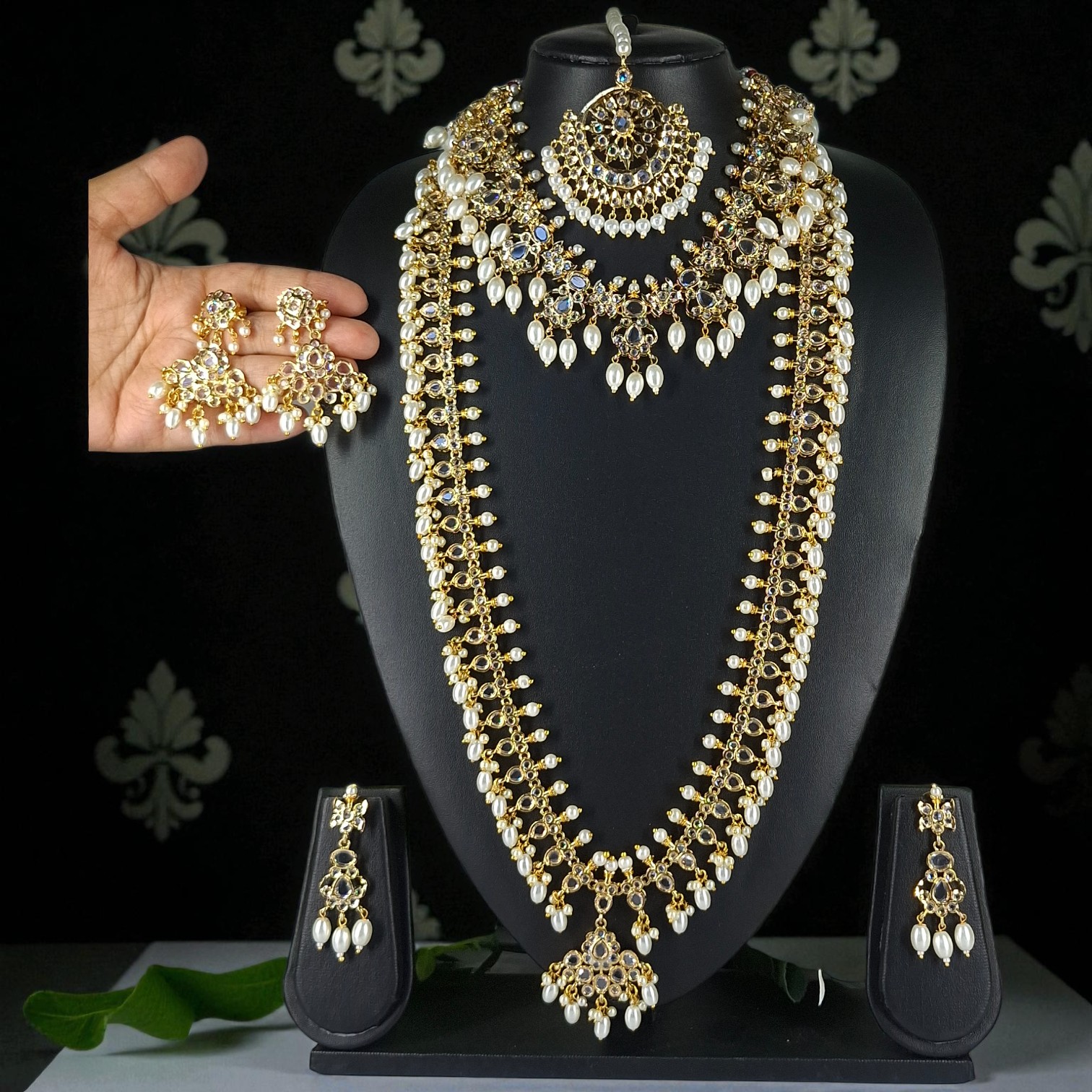 The Alina White Bridal Set is a breathtaking ensemble crafted to elevate a bride’s look on her special day. This luxurious set features a regal long haar, a beautifully detailed Necklace, an intricately designed tika , and perfectly matching earrings. Made with premium materials, each piece showcases exceptional craftsmanship. The striking white stones adds timeless elegance and sophistication, making the bride feel truly radiant on her big day.xquisite long haar enhances every look with elegance, making it a cherished addition to any jewelry collection.