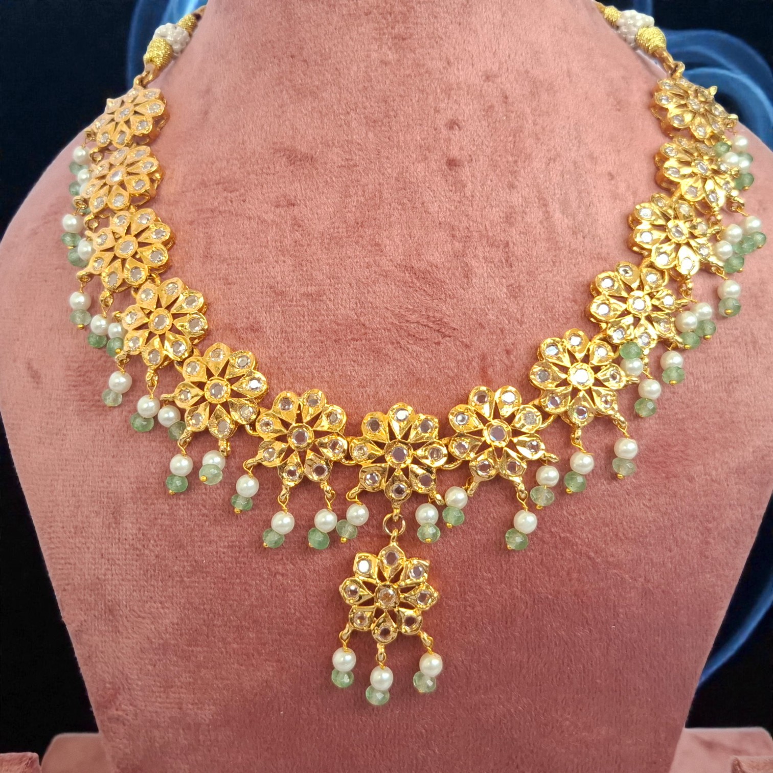Delicate pearl and green bead hangings enhance the design, adding graceful movement and charm. The centerpiece floral pendant creates a striking focal point, while the matching jhumki earrings complete the set with classic sophistication.