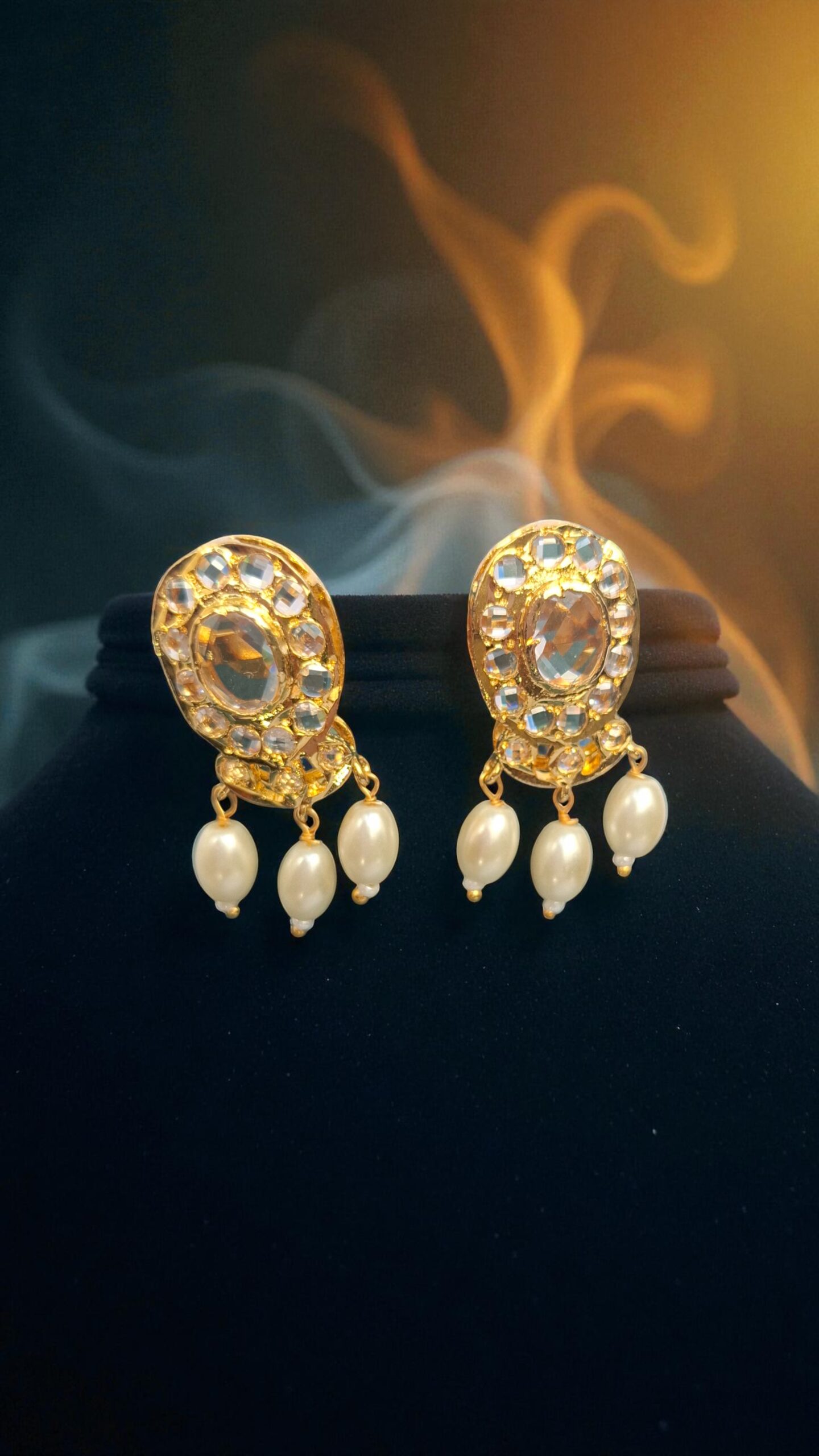 The mansha earrings is a stunning and elegant jewelry piece, meticulously plated with 22k gold for a radiant, long-lasting shine. It features beautifully arranged white stone that create a graceful blend of vibrance and sophistication.