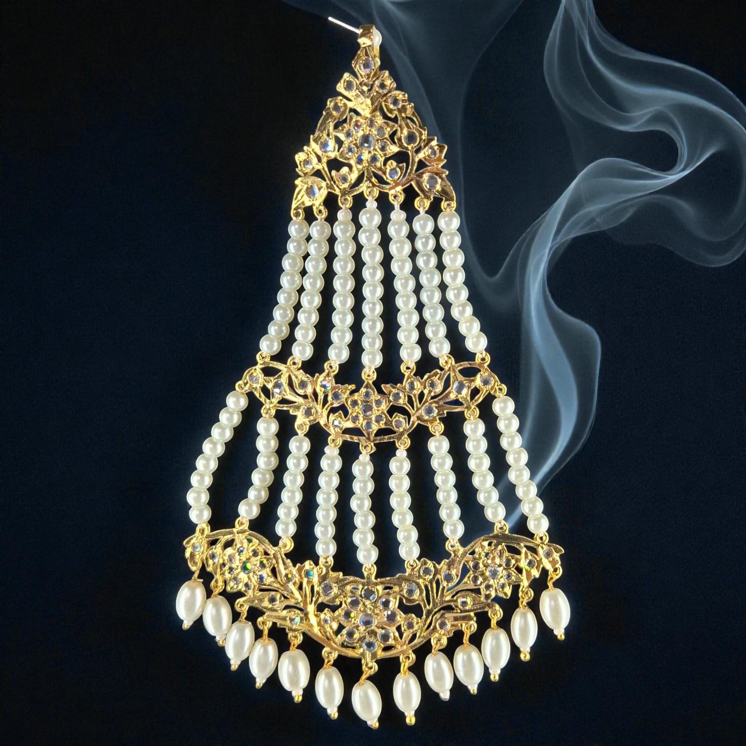 The Saba White Jhumar is a breathtaking 22k gold-plated headpiece featuring cascading strands of elegant white pearls that create a graceful, flowing silhouette. Intricately crafted polki-style floral panels add brilliance and richness to the design, while the pearl drops at the base enhance its traditional charm. Perfect for bridal wear and festive occasions, this timeless jhumar beautifully elevates any look with its refined elegance and regal craftsmanship.