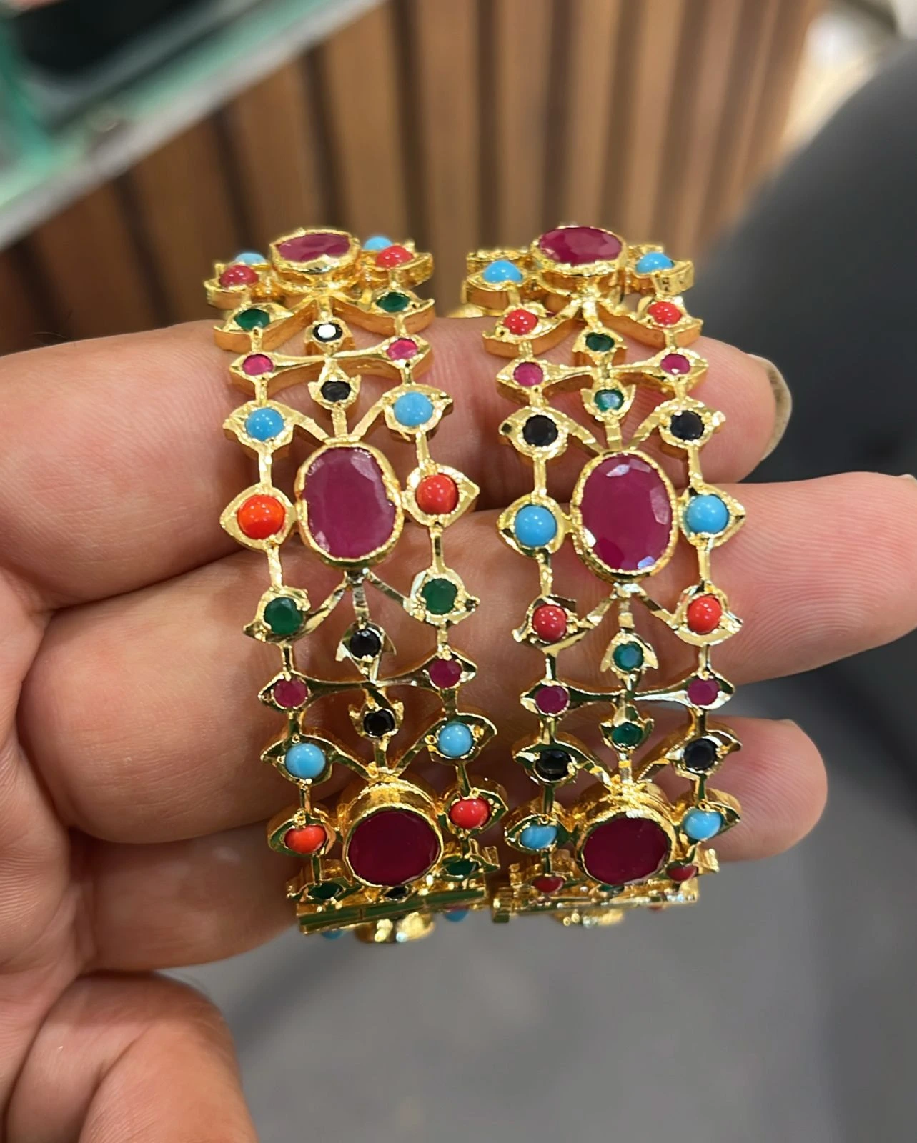 The Sana Multi Color Bangles is a truly stunning and elegant jewelry piece, meticulously plated with 22k gold to give a radiant, long-lasting shine. Adorned with graceful Multi Colored stones set against the golden base, it showcases a captivating design that balances tradition with modern sophistication.