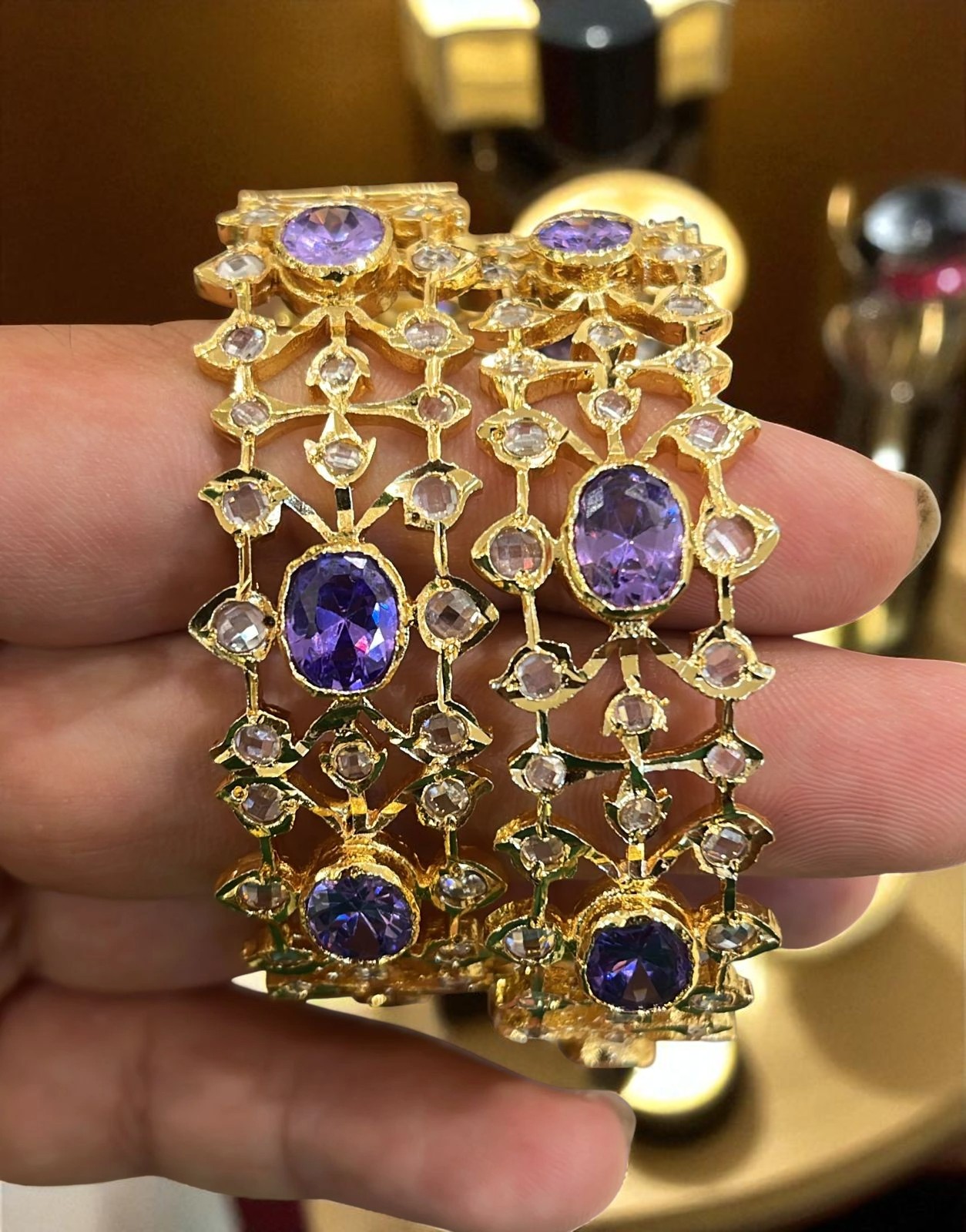 The Sana Purple Bangles is a truly stunning and elegant jewelry piece, meticulously plated with 22k gold to give a radiant, long-lasting shine. Adorned with graceful Purple and White stones set against the golden base, it showcases a captivating design that balances tradition with modern sophistication.