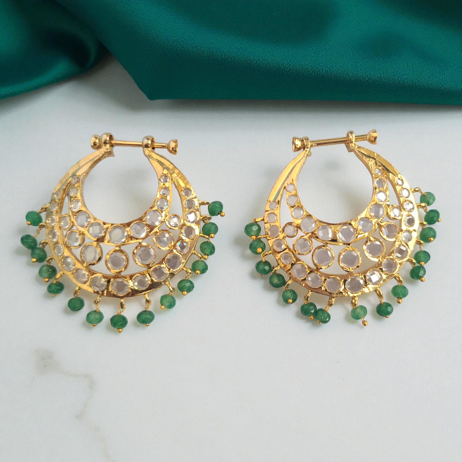 The Sona green chandbali is a stunning and elegant jewelry piece, meticulously plated with 22k gold for a radiant, long-lasting shine. It features beautifully arranged green stones that create a graceful blend of vibrance and sophistication.