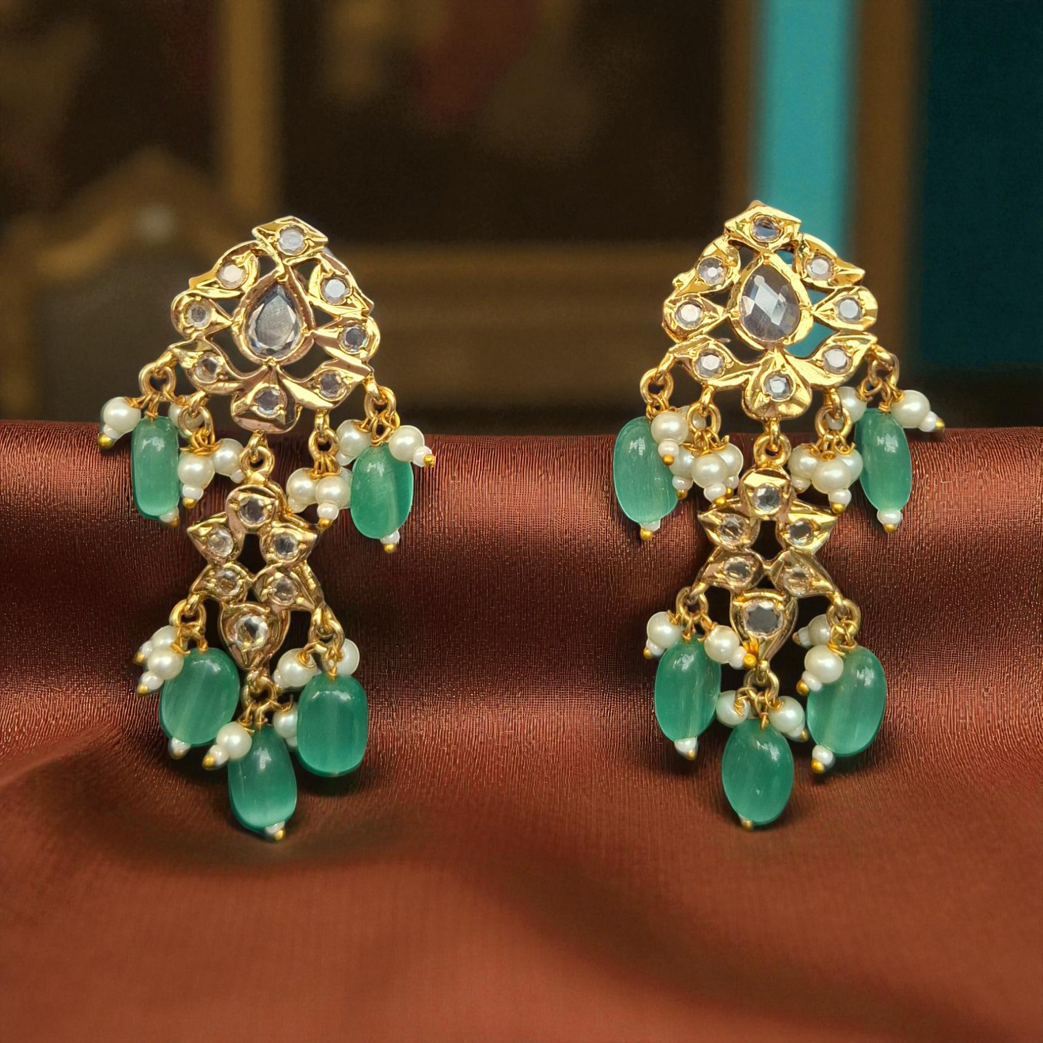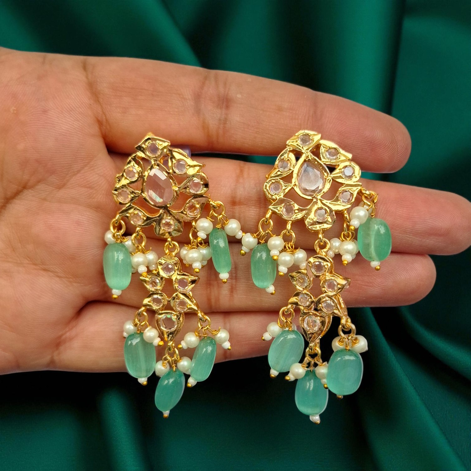 The Zikra mint earrings is a stunning and elegant jewelry piece, meticulously plated with 22k gold for a radiant, long-lasting shine. It features beautifully arranged mint stones that create a graceful blend of vibrance and sophistication.